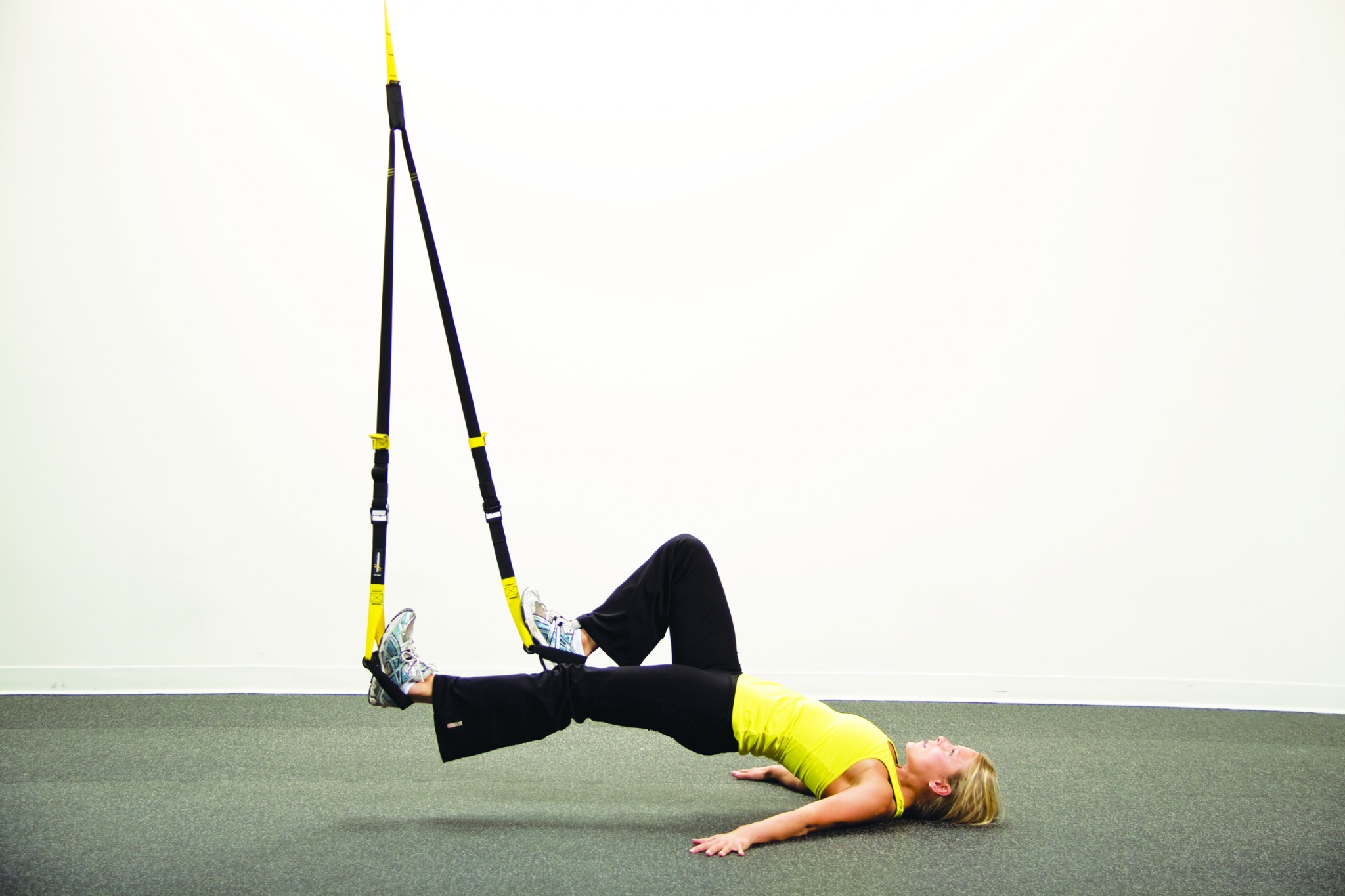 3. بالابری پاها با کشش تی آر ایکس: در حالت تاشون در، پایینترین نقطه طنابها را در دستها بگیرید. با حرکت کشش طنابها به سمت بالا، پاهای خود را باز و بالا ببرید تا ضربان قلب افزایش یابد و چربی در منطقه شکم سوزانده شود.